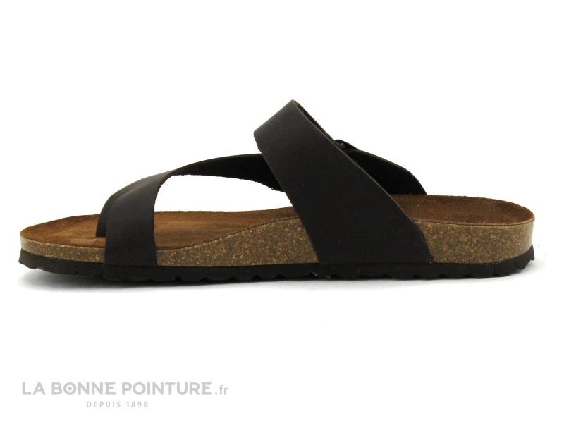 La tong homme Inter Bios bĂ©nĂ©ficie d’une large bride encuir veloutĂ© très souple marron foncĂ© qui enveloppe l’ orteil.