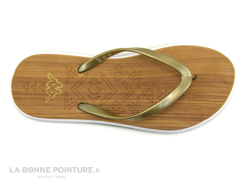 Ces tongs mode sont or (gold) avec la semelle beige façon bois, gravée de petites formes géométriques.