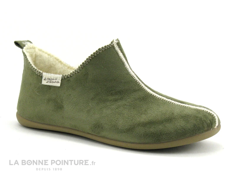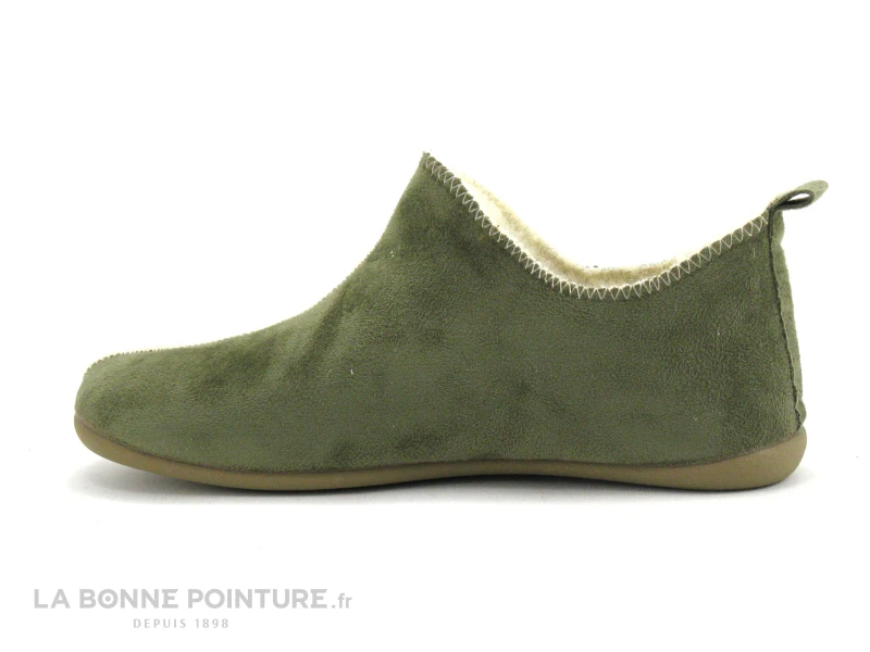 Cette pantoufle Femme intĂ©rieur laine Maison de l’Espadrille est en velours vert kaki, avec une couture contrastante beige sur le dessus.