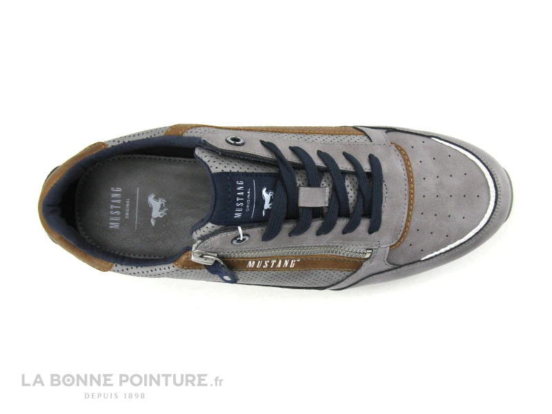 Ces belles baskets basses Homme Mustang 4154-316-2 sont en simili cuir gris, avec des petites touches de marron camel et de bleu marine.