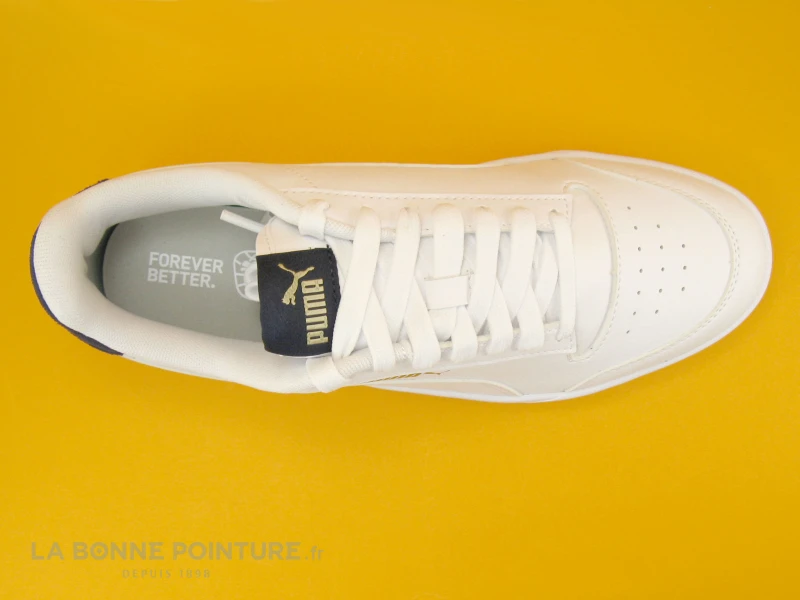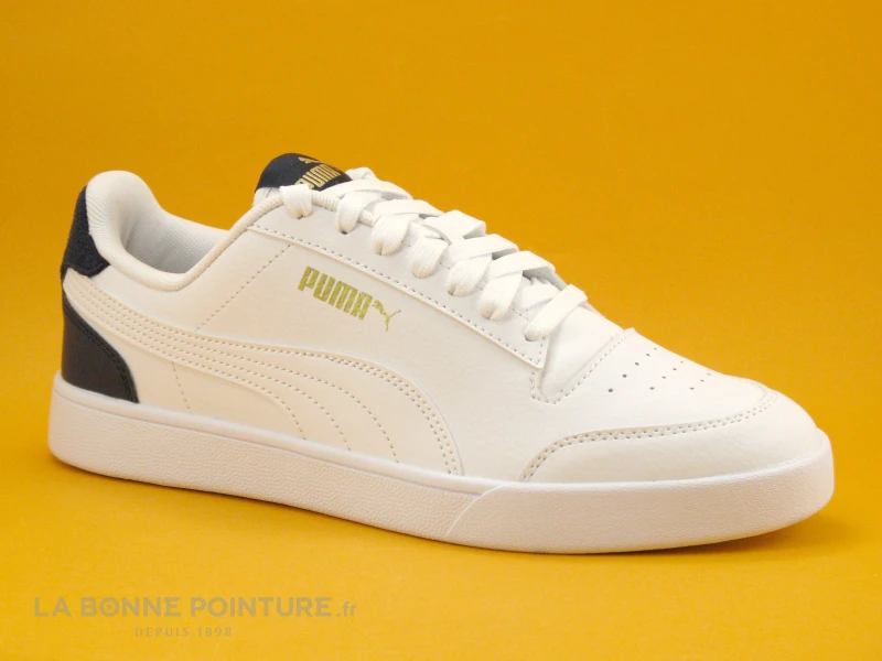 Cette basket Homme Puma Suffle est en simili cuir blanc aspect grainĂ©, avec du bleu foncĂ© Ă l’arrière ainsi que la marque et le logo Puma en dorĂ© sur la chaussure.