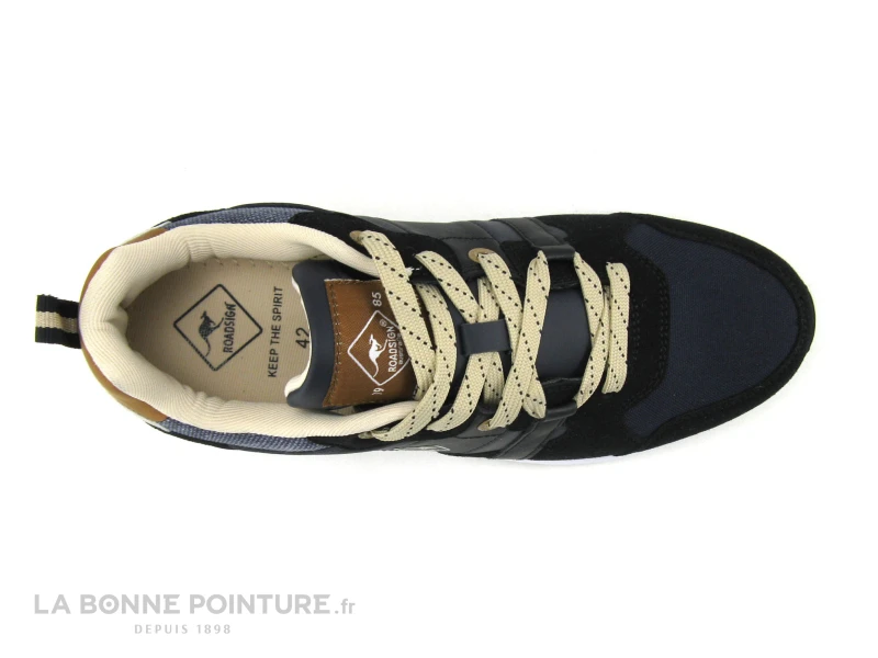Cette basket basse Homme RoadSign Australia mélange textile et simili cuir noir, bleu marine, beige et camel.