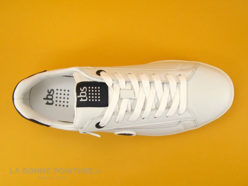 Cette basket de ville Homme Tbs Lillian est blanche avec du bleu marine Ă l’arrière et sur la languette.
