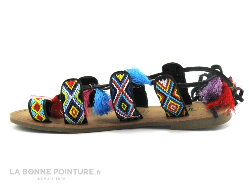 Cette tong Ă lacet est composĂ©e de brides et d’un passe-orteil noirs et tissĂ©s, avec des pompons multicolores.